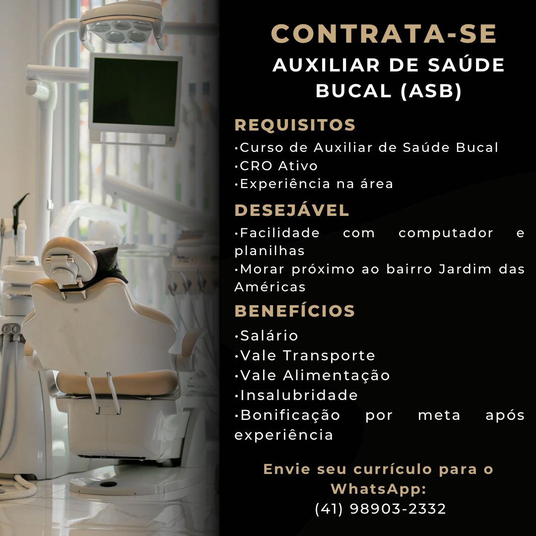 Clínica odontológica localizada em COLOMBO está contratando Auxiliar de saúde bucal.