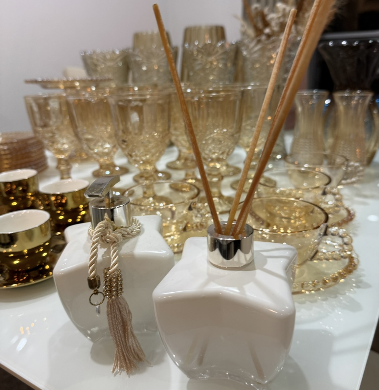 Cafeteira + xicaras + taças + vasos decorativos
