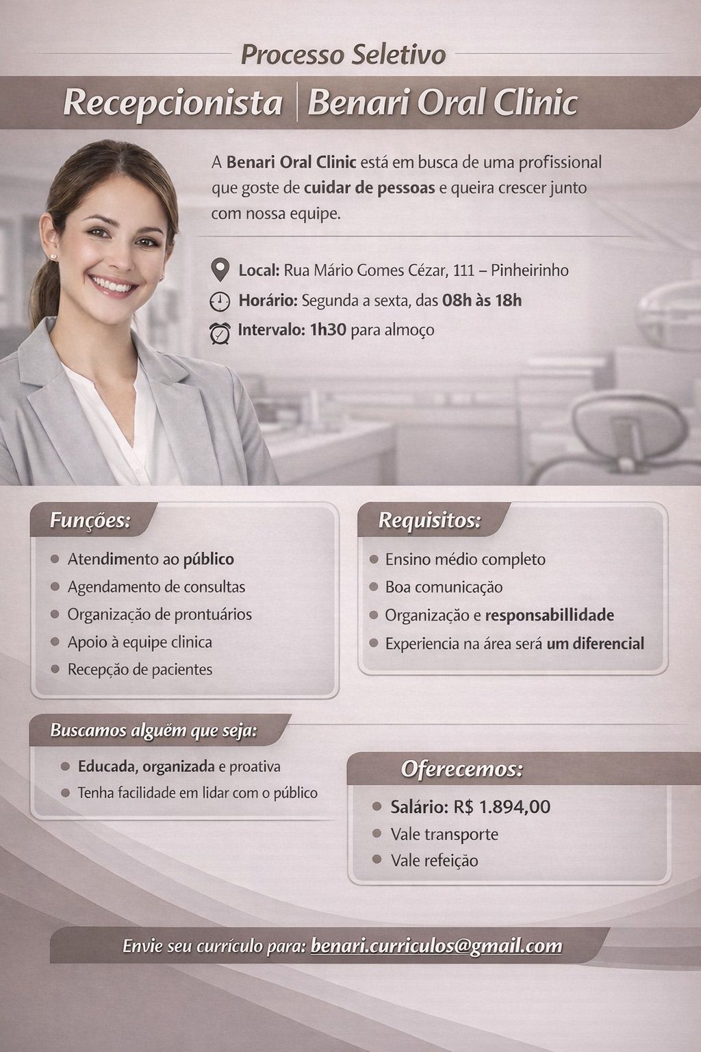 🦷 Processo Seletivo – Recepcionista | Benari Oral Clinic