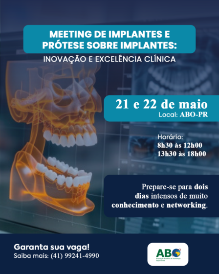 Nos dias 21 e 22 de maio, a ABO-PR realiza o Meeting de Implantes e Prótese sobre Implante – Inovação e Excelência Clínica, um evento científico imersivo que conecta conhecimento, prática clínica e as principais transformações da Odontologia contemporânea.