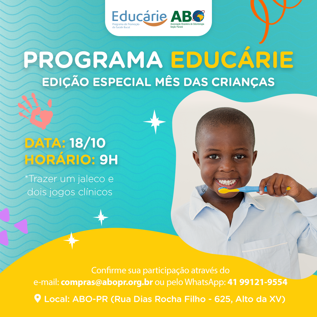 No dia 10 de março foi realizado o primeiro atendimento do Projeto Educárie deste ano, envolvendo pouco mais de 20 crianças de duas entidades assistenciais. O Cirurgião Dentista Dr. Fernando Machuca, Coordenador desta ação social da ABO-PR, comemora os avanços deste projeto, que tem recebido cada vez mais voluntários.