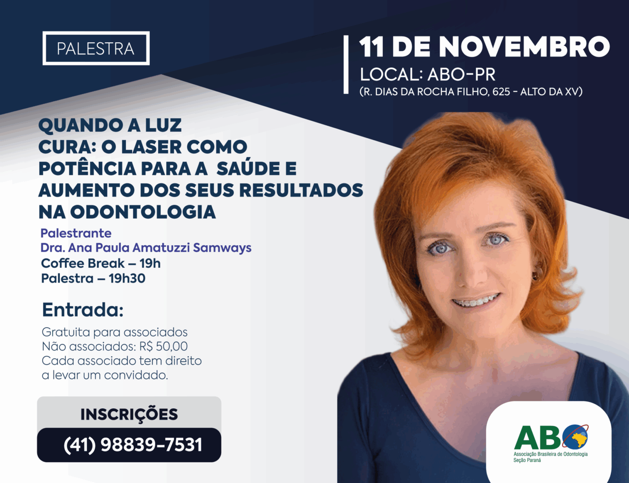 No dia 11 de novembro, a ABO-PR segue com a programação de palestras com um tema que tem revolucionado a prática clínica: o uso do laser como aliado na saúde e nos resultados da Odontologia. A palestra “Quando a luz cura: o laser como potência para a saúde e aumento dos seus resultados” acontece das 19h30 às 21h, com lanche de boas-vindas às 19h, e é uma ótima oportunidade para quem busca ampliar repertório e trazer mais tecnologia para o consultório.